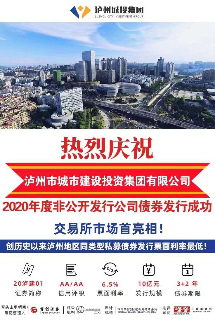 9月25日,瀘州城投集團(tuán)2020年度首期非公開發(fā)行公司債成功發(fā)行,發(fā)行金額10億元,期限3+2年,票面利率6.50%,創(chuàng)歷史以來瀘州地區(qū)同類型私募債券票面利率最低。本期債券牽頭主承銷商為首創(chuàng)證券,現(xiàn)已認(rèn)購?fù)戤叄?dāng)日資金已到達(dá)瀘州城投集團(tuán)公司賬戶。這是瀘州城投集團(tuán)在債券市場(chǎng)首次亮相,未采取擔(dān)保、抵押、增信等手段,是提高資本市場(chǎng)認(rèn)可度的一次成功檢驗(yàn)。